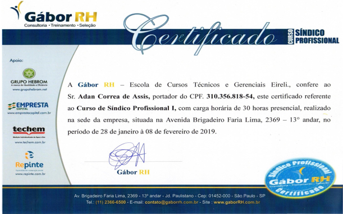 Formado na grande São Paulo em um dos mais renomados instituto centro de formação, realizou curso de síndico profissional e especialização, atualmente continua se especializando no segmento condominial fazendo parte de um grupo de síndicos de amplitude nacional com mentorias e renovação de conhecimento diários, tudo para proporcionar o melhor trabalho de síndico e consultorias aos condomínios. Sua experiência de especialista em manutenção, administração, gestão de conflitos e liderança de pessoas, proporciona alto desempenho na atuação como síndico profissional.